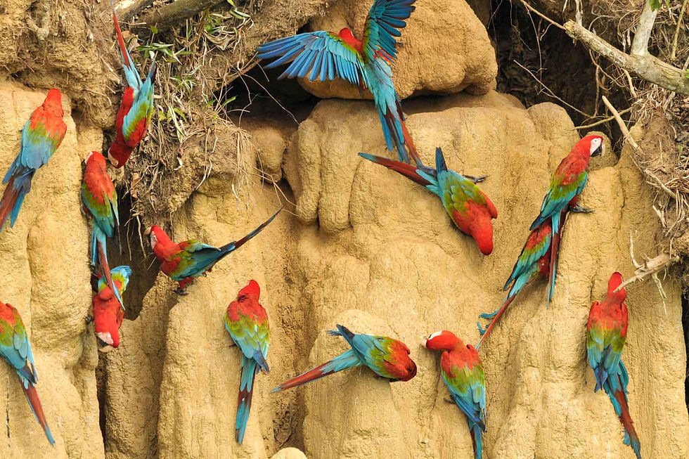As you sit, subtly hidden on a small river island, the Amazonian sun begins to light up the clay cliff. Suddenly, shrieks and caws fill the air as the jungle’s most charismatic birds swoop down to the Macaw Clay Lick, or Collpa, as it’s known here. Soon, dozens of tiny parakeets, colorful parrots, and brilliant macaws perch and preen on the cliffs. For one of the best tropical bird experiences in the Amazon, you need to visit the Macaw Clay Lick. Due to nutrients, most likely salt, found in the cliff soil, the Clay Lick attracts dozens of species of birds. From huge Red and Green Macaws to Mealy Parrots, the birds flock here to munch on nutrient-rich clay. The macaws are the largest — and loudest — of the bunch, leaving a lasting impression on everyone who sees them.