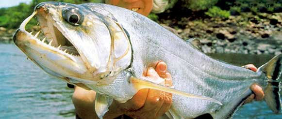 Like all the animals in the reserve, fishes are wild and ferocious, big and strong. Payara, Tucunaré, wolf fish are some of them. You will get exciting bites, hard fighting, high jumping of these ferocious gamefish in one of the biggest rainforest of the world. The waters of Tambopata River offer us a variety of fishes such as Payaras, Pacu (Giant Piranha), Catfish (Zungaros, Piros, Surubim, etc.) Locals usually fish for Payara with spinning and casting tackle. There's a lot of black volcanic rocks in the river and the Payara hunt sardines very close to the shore. The technique is to cast from the rock’s lures like rapala's magnum or sliver, rebel fast track or jawbreaker.